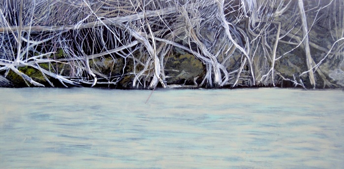 depuis le milieu du lac, tusche auf holz ca. 50 x 25 cm < weitere Zeichnungen >